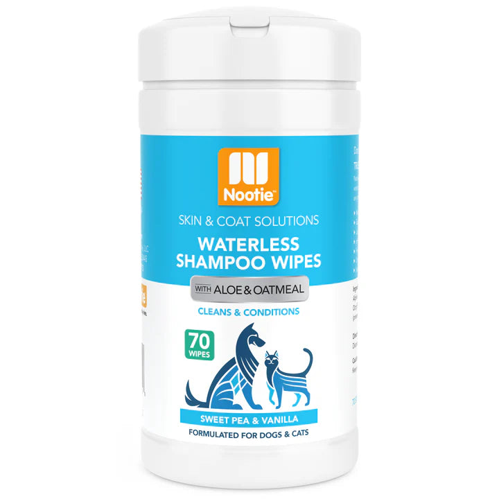 Garder votre animal propre et sentir frais entre les bains est facile avec les lingettes shampoing sans eau Nootie. Cette formule désodorisante sans rinçage, sans alcool contient des ingrédients nettoyants actifs ainsi que de la glycérine adoucissante pour le pelage et de l'aloès et de la farine d'avoine apaisants pour nettoyer et revitaliser la peau et le pelage de votre animal.